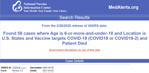 Executive summary There are 58 death reports in VAERS for those over 6 and under age 18 for the COVID shots. In any sane society, that would be an immediate stopping condition for a vaccine. I downloaded all 58 reports and had an unbiased AI chatbot analyze them. 75% of the deaths were likely related […]