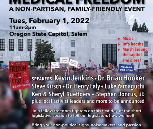 Steven Kirsch - Jan 31st 2022 3:04am EST The rally (organized by Children’s Health Defense) will be at the Capitol Mall right across the street from the Salem Capitol building. Starts at 11am on Feb 1. More info. You can hear from one of the “Disinformation Dozen” Kevin Jenkins. I’ll be speaking as well.