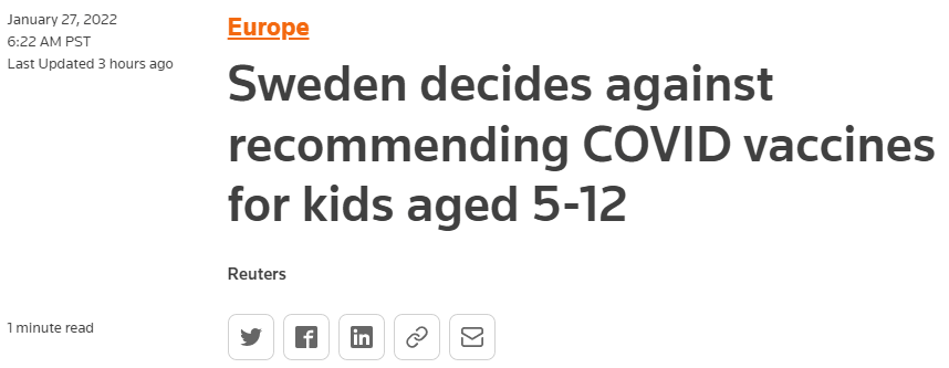 Steven Kirsch - Jan 27th 2022 12:41pm EST Here’s the Reuter’s article on Sweden and the COVID vaccines: Sweden couldn’t find any benefit of the COVID vaccines since the rates of serious disease are so low. Here in the US, we can’t find any benefit either, but that doesn’t matter. In fact, the risk-benefit analysis is strongly negative. Here’s the risk benefit analysis […]