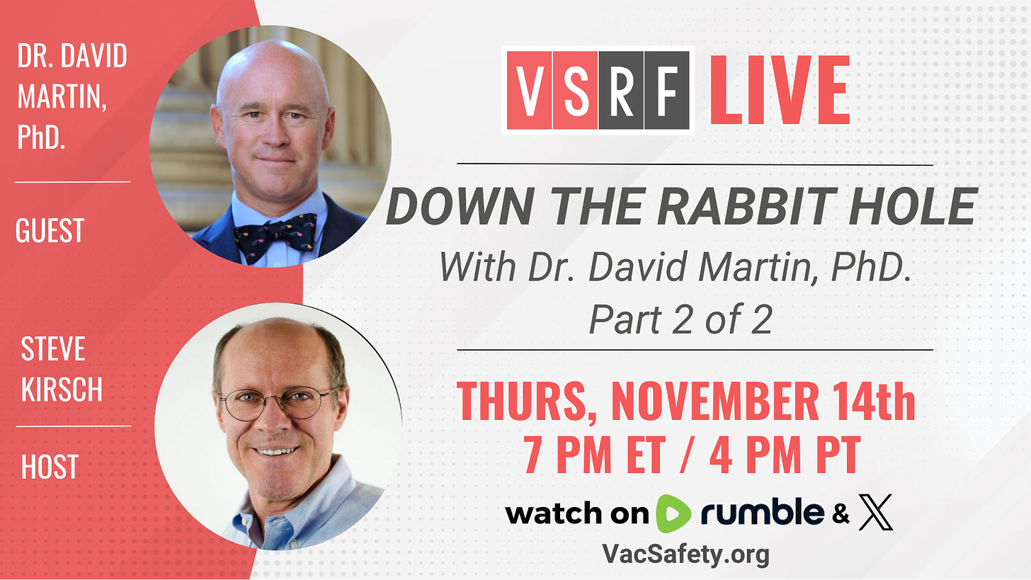 Steven Kirsch - Nov 14th 2024 11:07am EST This Thursday at 7pm EST | 4pm PST on VSRF LIVE we will host our 2nd of 2 interviews with Dr. David Martin, PhD. Dr. David Martin first joined us in August of 2024 where we discussed the military’s role in the development of the C19 vaccine, the fate of our country post election and […]