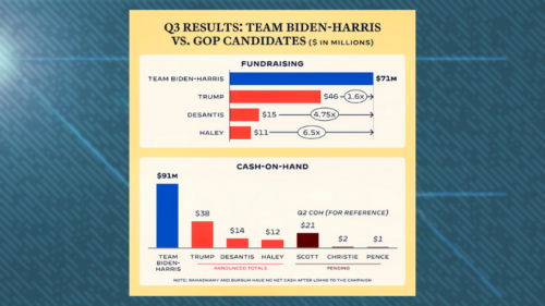 Tim Pool - Oct 16th 2023 4:56pm EDT The Biden campaign has 72 million reasons to be happy. The first Federal Election Commission (FEC) filing of the 2024 election season shows the campaign raked in $72 million — more than doubling the funds raised by the Trump campaign. The filings for President Joe Biden and former President Donald Trump show a wide gap […]