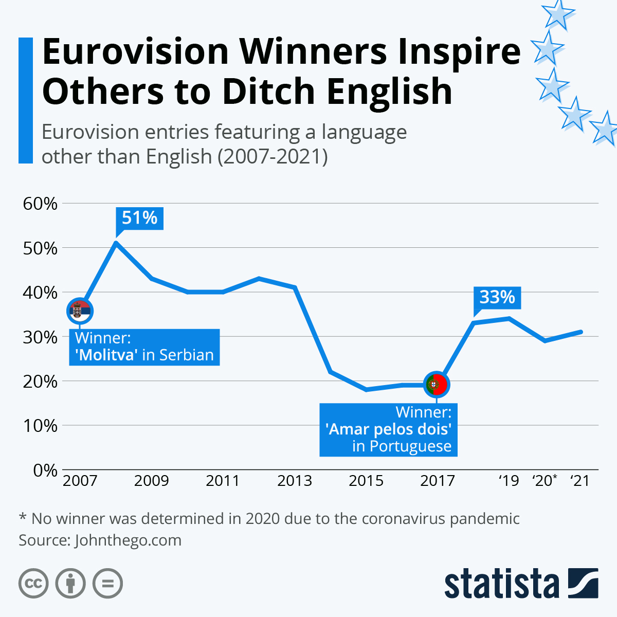 ZeroHedge - May 24th 2021 2:45am EDT Eurovision Winners Inspire Others To Ditch English (And Snort Cocaine?) In the 2021 Eurovision Song Contest, around a third of all entries from the 39 participating countries contain a language other than English. Countries have been free to choose the language in which they sing since 1999 and after that date, many have opted for lingua franca […]