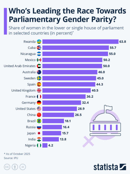ZeroHedge - Oct 21st 2025 5:45am EDT 64% Of Rwanda Politicians Are Women; Just 4% In Nigeria Data from the Inter-Parliamentary Union shows the extent to which differences in gender equality in parliament exist between countries, with only four nations currently representing an even or almost even 50:50 split of men to women in their lower house of parliament. These are Andorra, Mexico, Bolivia […]