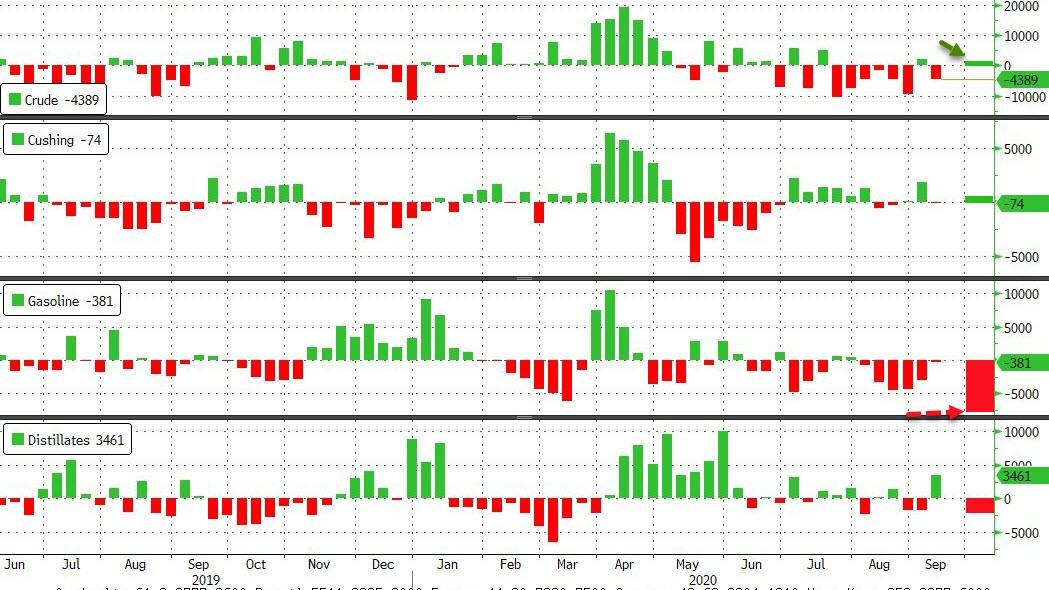 ZeroHedge - Sep 22nd 2020 4:36pm EDT WTI Holds Gains Amid Surprise Crude Build, Large Gasoline Draw Tyler Durden Tue, 09/22/2020 – 16:36 Amid Hurricane Laura and Tropical Storm Beta shut-ins, and concerns over 2nd or 3rd (or whetever) waves of COVID cases, there is plenty of noise but WTI prices managed a small rebound todays after yesterday’s bloodbath in black gold. […]