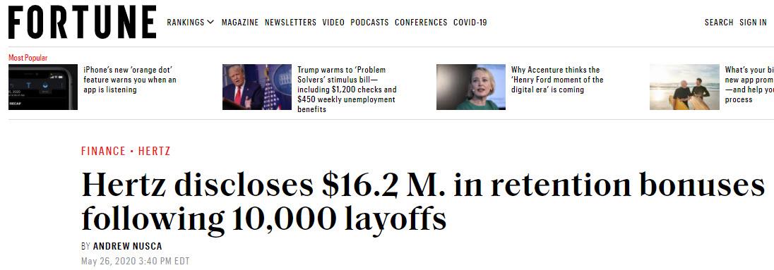 ZeroHedge - Sep 18th 2020 6:00pm EDT Angry Judge Slams Bankrupt Hertz’ “Offensive” Attempt To Pay Another $5.2 Million In Management Bonuses Tyler Durden Fri, 09/18/2020 – 18:00 It’s not exactly clear what the lawyers of bankrupt Hertz were thinking but the first time the company spent a whopping $16.2 million on corporate retention bonuses just one day after it announced it […]
