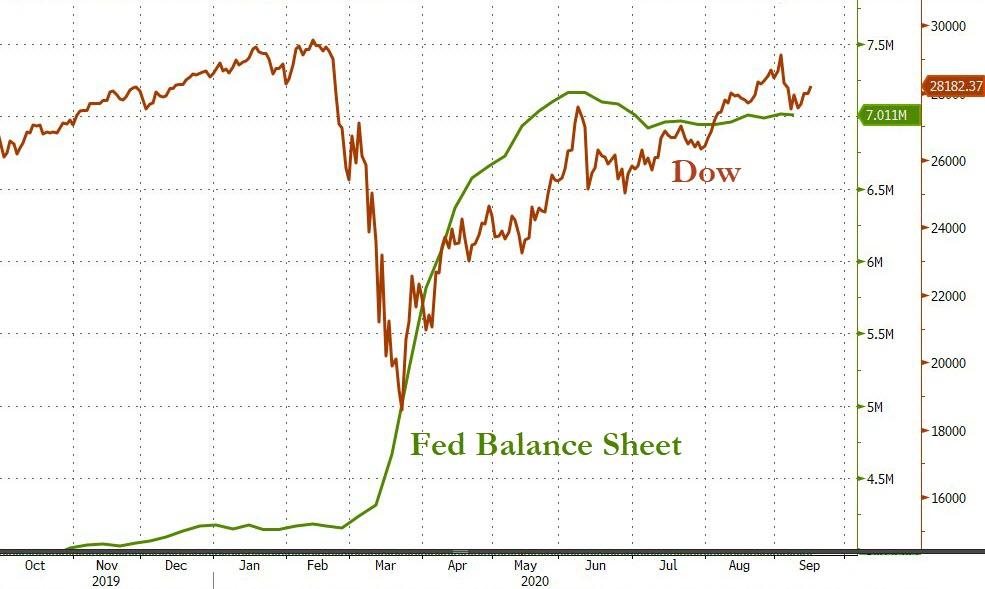 ZeroHedge - Sep 16th 2020 4:00pm EDT Stocks Pump’n’Dump On Fed Financial Stability Fears Tyler Durden Wed, 09/16/2020 – 16:00 Lower (rates) for longer (at least 2024) but inflation, growth, and rate projections are all inconsistent. As Peter Boockvar at Bleakley Advisory Group points out the committee cut its 2021 GDP forecast to 4% from 5%, while at the same time lowering […]