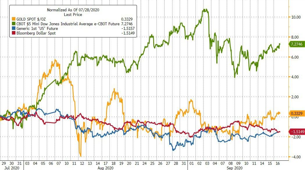 ZeroHedge - Sep 16th 2020 2:05pm EDT FOMC Signals Rates Unchanged Through At Least 2023 Despite GDP Forecast Upgrade Tyler Durden Wed, 09/16/2020 – 14:05 Since the last FOMC statement on July 29th, stocks have been in a world of their own (outperforming) while gold, bonds, and the dollar have shown only modest moves… Source: Bloomberg 10Y Yields are up around 10bps […]