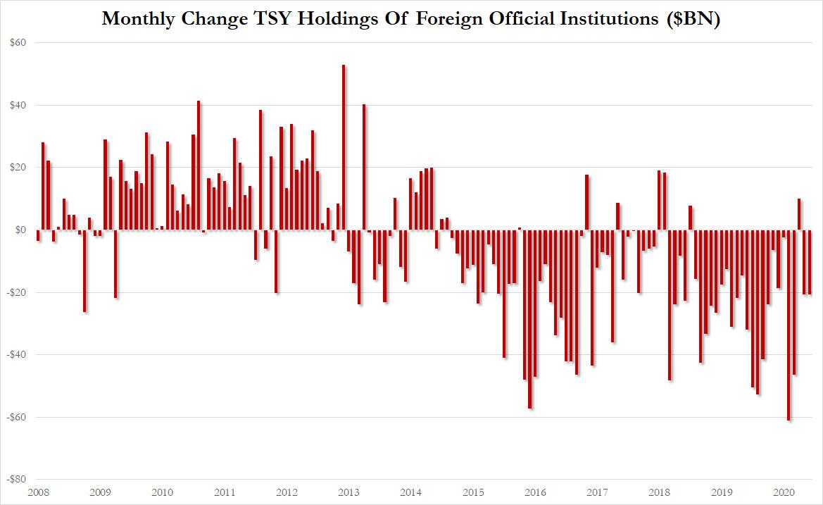 ZeroHedge - Sep 16th 2020 4:36pm EDT Foreigners Dump Record $54BN In Corporate Debt As Japan Treasury Holdings Surge To All Time High Tyler Durden Wed, 09/16/2020 – 16:36 Foreigners resumed selling long-term US Treasuries in July, offloading $22.8 billion (after buying $28.9BN in June), in yet another spending spree led by foreign official institutions, i.e. central banks, SWFs and reserve managers, […]