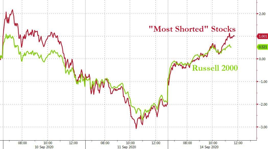ZeroHedge - Sep 14th 2020 4:03pm EDT Small Caps, Big-Tech, & Bullion Bounce As Dollar Dives Tyler Durden Mon, 09/14/2020 – 16:03 The ‘Rick Astley’ market is back… “Never gonna let you down”… Another day, another short-squeeze (“most shorted” stocks rose 3% on the day, erasing the losses from Thursday and Friday)… Source: Bloomberg Which explains why Small Caps outperformed so handsomely. […]