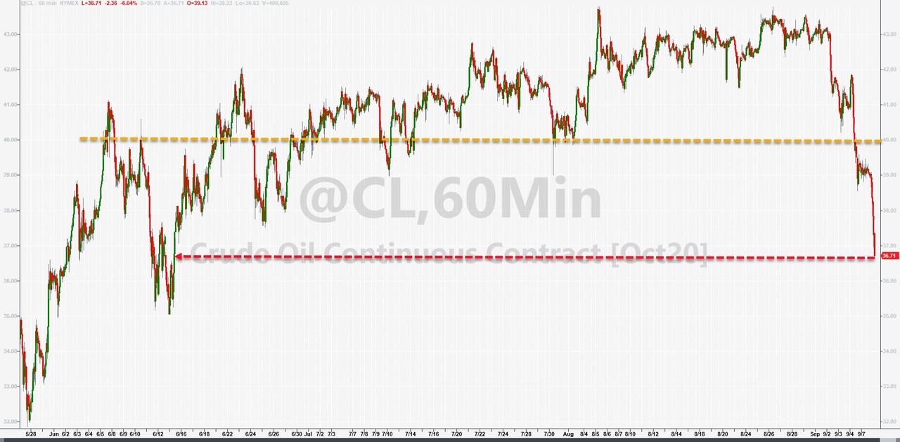 ZeroHedge - Sep 8th 2020 10:08am EDT Oil Plunges 5%, Biggest Drop Since June Tyler Durden Tue, 09/08/2020 – 10:08 With growth stocks getting pummeled, one would think that there is at least some rotation out of growth and into value sectors. Alas, one would be wrong, because the core commodity behind so many “value” strategies, oil, is plunging even more than […]