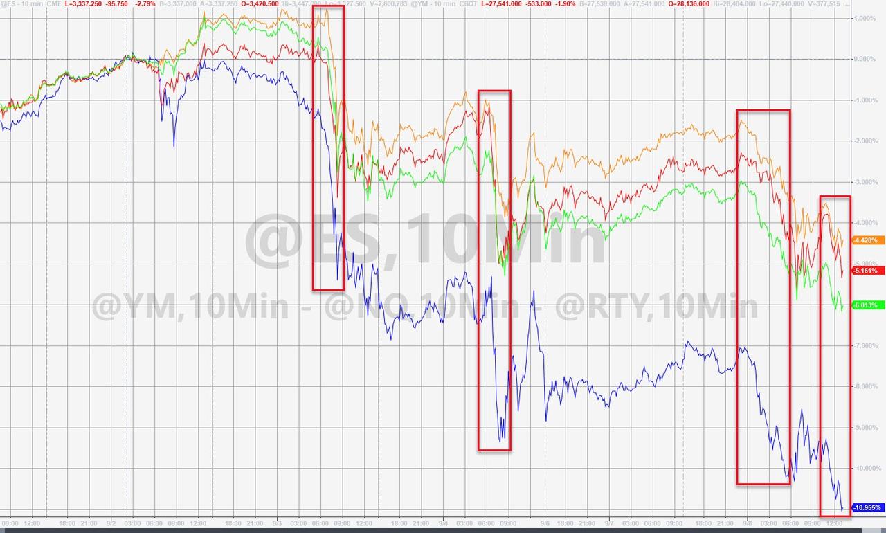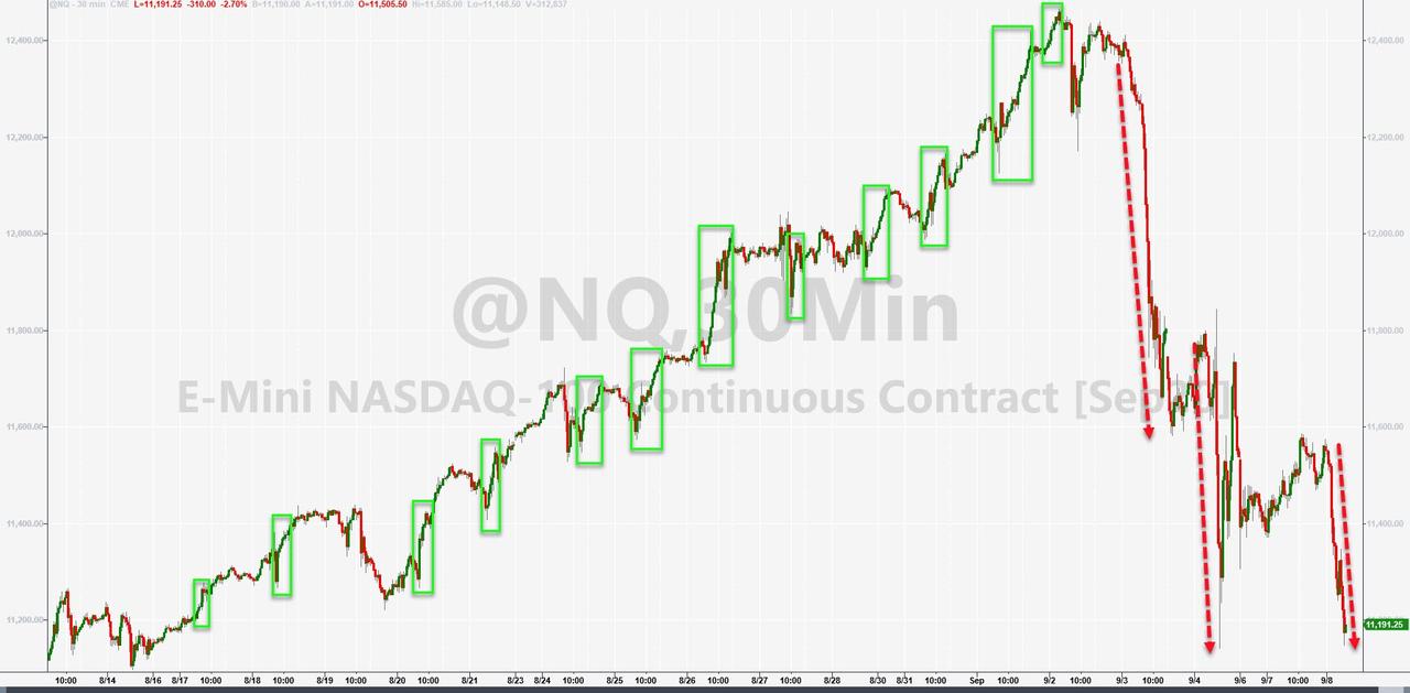 ZeroHedge - Sep 8th 2020 4:01pm EDT Crude Crushed, Tech Wrecked, Banks Battered; Bonds & Bullion Bid Tyler Durden Tue, 09/08/2020 – 16:01 Nasdaq futs are down 11% (correction from their highs last week), and the rest of the majors are down around 5%… This is Nasdaq’s worst 3-day performance since March. Turn the Softbank machines back on!!!! From Friday’s close, Nasdaq […]