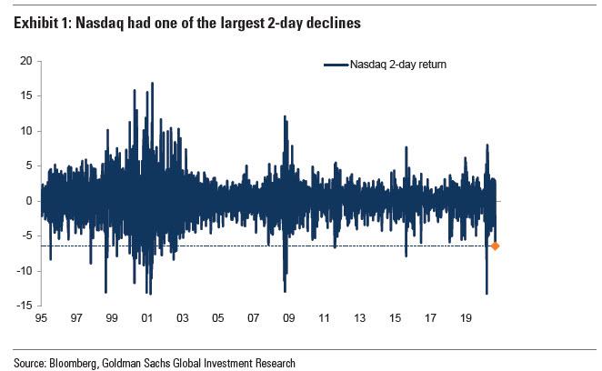ZeroHedge - Sep 7th 2020 6:45pm EDT Goldman Warns Of “Near-Term Setback” For Stocks As Record Bullish Nasdaq Sentiment Suffers Near-Record Shock Tyler Durden Mon, 09/07/2020 – 18:45 In a stark reminder of the market excesses reached last week, Goldman writes that the Nasdaq had one of the largest 2-day declines in the last 30 years after the SoftBank gamma trade was […]