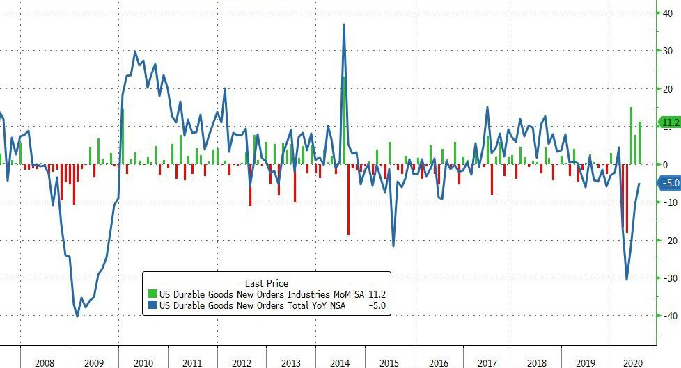 ZeroHedge - Aug 26th 2020 8:38am EDT US Durable Goods Orders Smash Expectations In July Thanks To ‘War’ Tyler Durden Wed, 08/26/2020 – 08:38 After its initial spike back in May, Durable Goods Orders rebound has slowed and that deceleration of the ‘V’ was expected to continue in today’s preliminary July data, but instead saw a resurgence… rising 11.2% MoM (against expectations […]