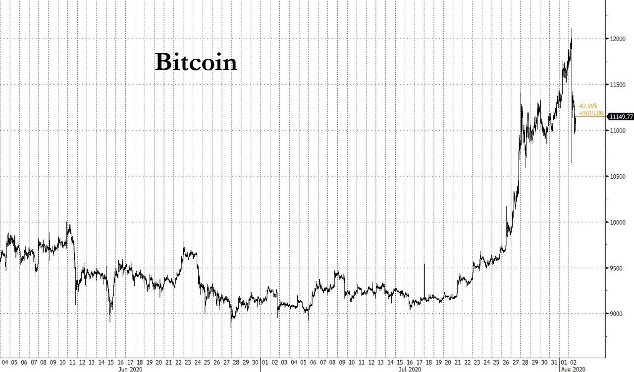 ZeroHedge - Aug 2nd 2020 10:37am EDT Bitcoin Hits 1 Year High Then Plummets After “Someone” Liquidates $1 Billion In Seconds To Hammer Price Tyler Durden Sun, 08/02/2020 – 10:37 The infamous cryptocurrency dash-and-smash was on full display overnight, when shortly after midnight ET, bitcoin hit a one year high of $12,112 – rising 20% in just the past week when it […]