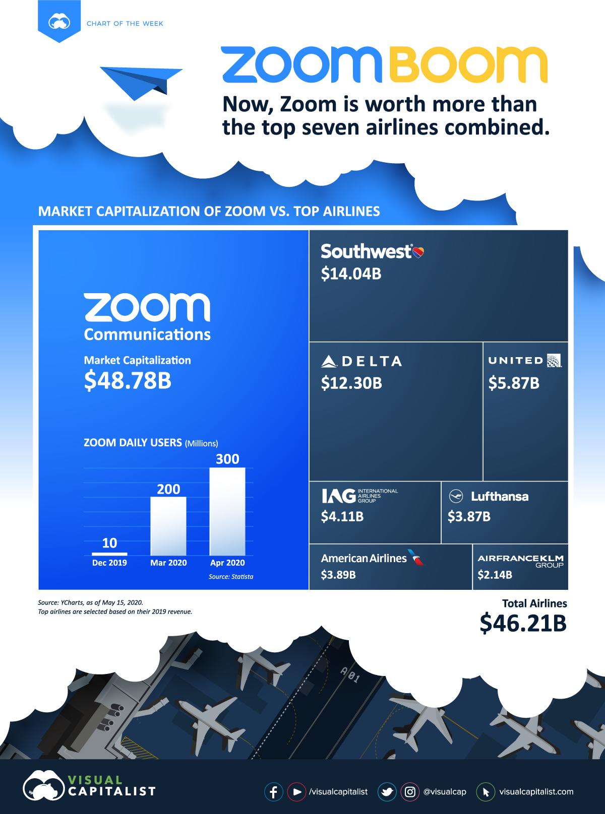 ZeroHedge - May 17th 2020 10:50am EDT Zoom Is Now Worth More Than The World’s 7 Biggest Airlines Tyler Durden Sun, 05/17/2020 – 10:50 Amid the COVID-19 pandemic, many people have transitioned to working – and socializing – from home. If these trends become the new normal, certain companies may be in for a big payoff. Popular video conferencing company, Zoom Communications, […]