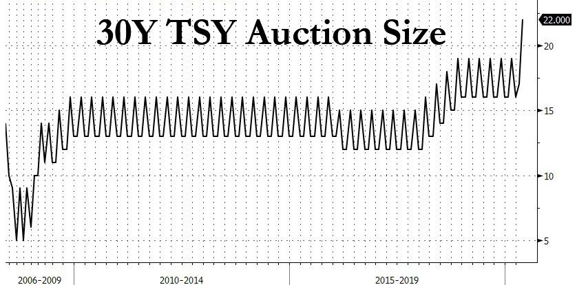 ZeroHedge - May 13th 2020 1:21pm EDT Record Big 30Y Treasury Auction Tails Amid Mediocre Demand A week of record sized refunding treasury auctions has concluded with today’s sale of $22 billion in 30Y paper, which as we discussed last week, was the largest auction of this tenor in history. However, unlike the 3Y and 10Y auctions which priced earlier this week, […]
