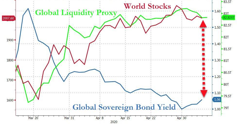 ZeroHedge - May 8th 2020 6:00am EDT Investors “Need To Be Mindful” As Bonds & Stocks Suffer “Biggest Disconnect” Since the early March lows, Global stock markets are up over 25%, global central bank sponsored liquidity is up over $3 trillion, and global sovereign bond prices are also up around 3%. As the chart below shows, bonds and stocks are sending drastically […]