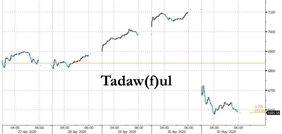 ZeroHedge - May 3rd 2020 7:01pm EDT Stocks, Yuan, Oil Are All Tumbling As Asia Opens No Buffett buying spree, and no Federal bailout #4 (or is it 6?)… and the result – in admittedly thin liquidity – is US equity futures, crude oil futures, and offshore yuan are all dumping as Asian markets open… Dow futures are down over 350 points… […]