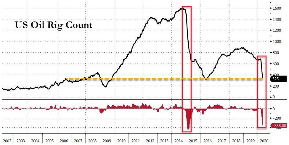 ZeroHedge - May 1st 2020 1:11pm EDT US Oil Rig Count Collapses As Wave Of Shale Well Closures Begins For the 7th straight week, the US oil rig count has plunged (down 53 to 325). This is the biggest drop since the 2015 collapse and the same total oil rig count first seen in 2006… And while U.S. shale oil producers have […]