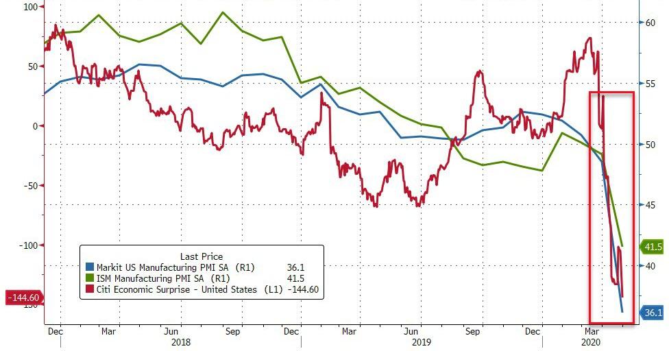 ZeroHedge - May 1st 2020 10:05am EDT US Manufacturing Surveys Show Record Collapse In Output, Orders, & Jobs Following the utter devastation across all regional Fed surveys, it should be no surprise that this morning’s national manufacturing surveys (ISM and Markit) are a disaster. Markit US Manufacturing 36.1 – 11-year low (weaker than expected and worse than the flash print) PMI US […]