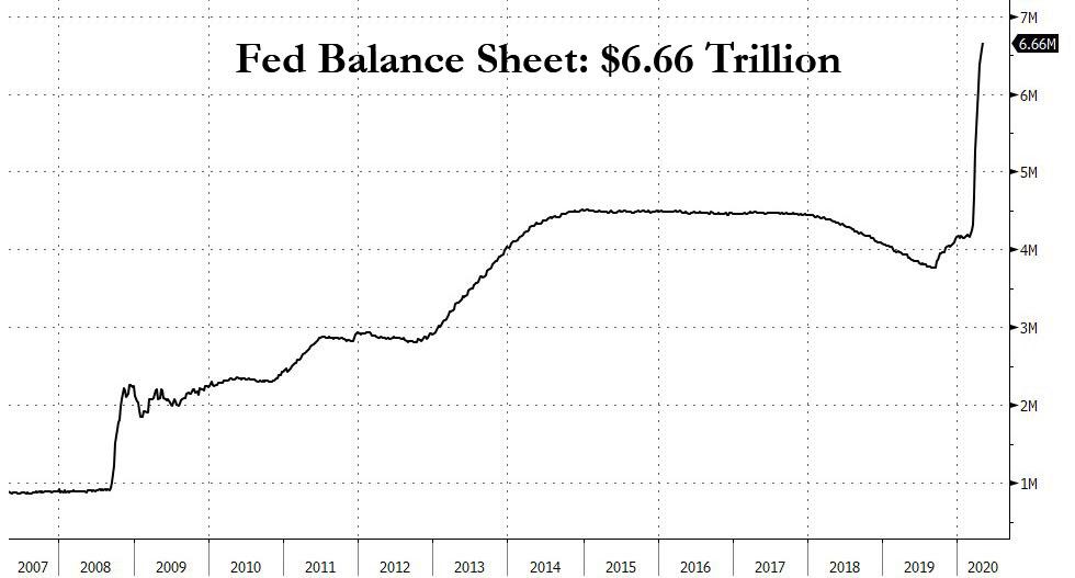 ZeroHedge - Apr 30th 2020 7:30pm EDT $6.66 Trillion Well at least our satanic overlords have a sense of humor. According to the latest Fed balance sheet, as of April 29, the Fed’s balance sheet increased by 82.8 billion dollars over the past week, rising to a record 6,655,929,000,000 which, of course rounds up to $6.66 trillion (also, who can possibly forget […]