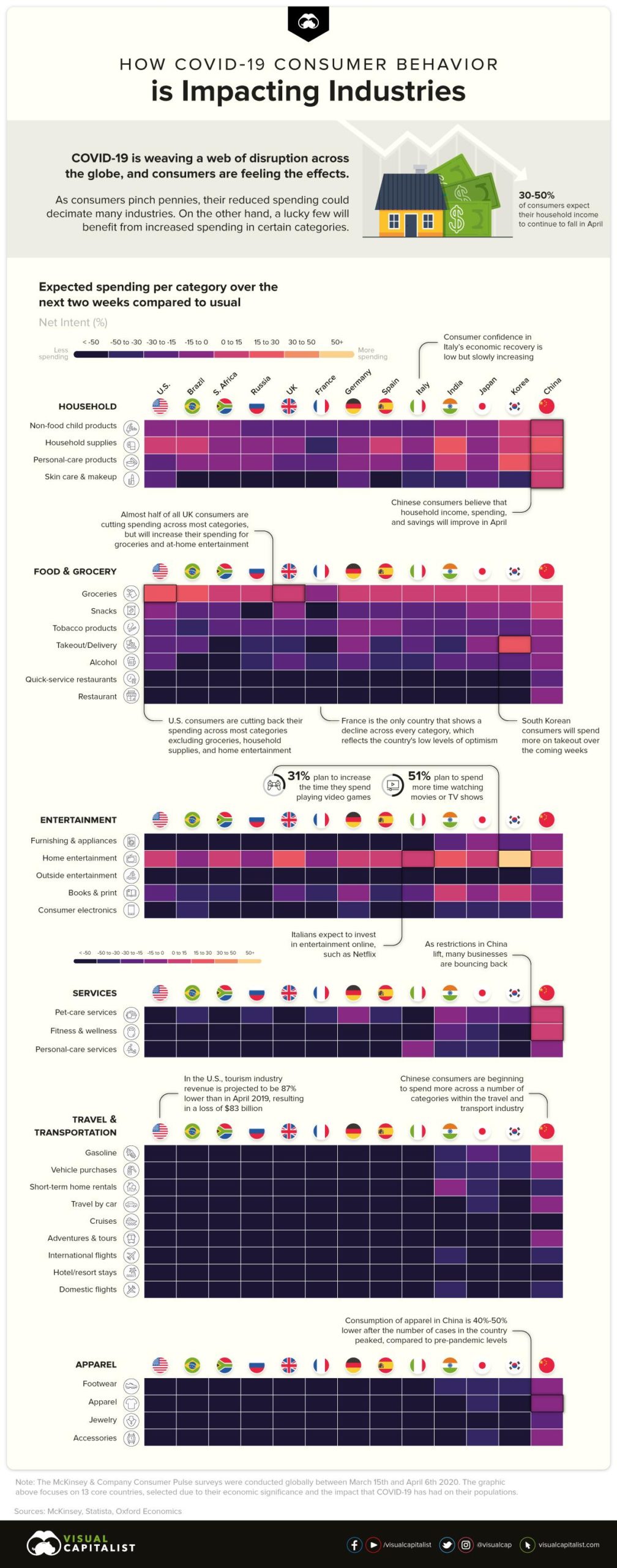 ZeroHedge - Apr 28th 2020 11:45pm EDT Visualizing How COVID-19 Consumer Spending Is Impacting Industries Consumer spending is one of the most important driving forces for global economic growth. Beyond impacting some of the factors that determine consumer spend – such as consumer confidence, unemployment levels, or the cost of living – Visual Capitalist’s Katie Jones notes that the COVID-19 pandemic has […]