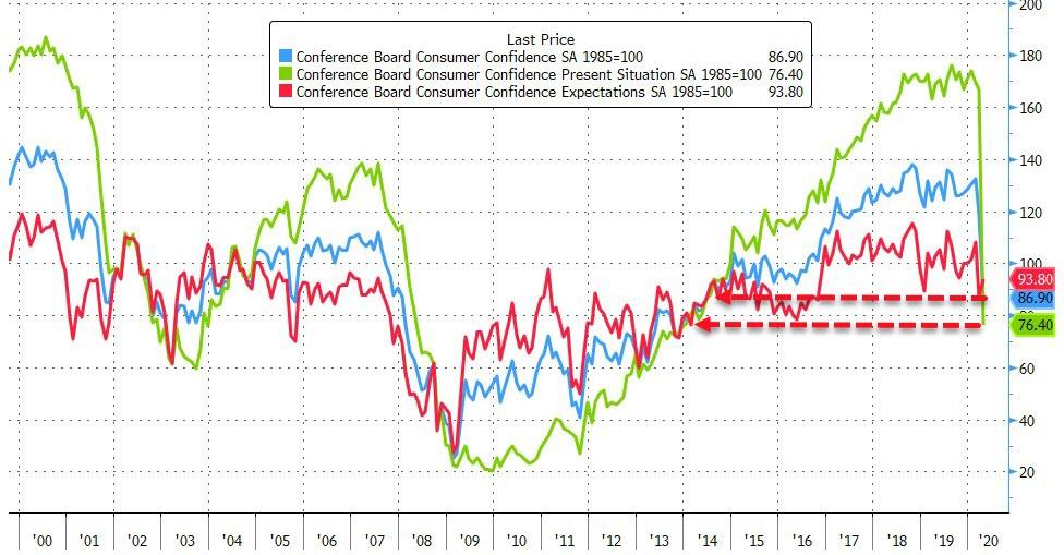 ZeroHedge - Apr 28th 2020 10:09am EDT US Consumer Confidence Collapses, Richmond Fed Crashes To Record Lows After plunging in March, expectations were for The Conference Board confidence survey to crash even further in April as COVID concerns began to really rage and lockdowns went nationwide. The Conference Board’s headline index plummeted by 31.9 points, the sharpest drop since 1973 to its […]
