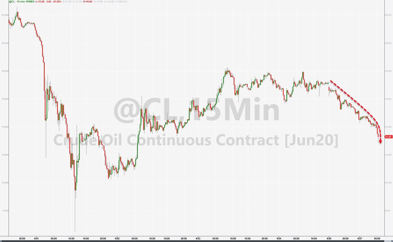 ZeroHedge - Apr 27th 2020 10:04am EDT Oil Tumbles As Traders Frontrun USO Liquidation Of Entire June Exposure While the culprits behind last week’s historic oil plunge to a negative $40/barrel have yet to be conclusively identified, with some pointing fingers at US retail traders, while others blaming tremendous losses in Chinese structured products, one clear usual suspect is the USO, the […]