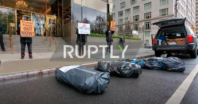 ZeroHedge - Apr 19th 2020 3:10pm EDT “Trump = Death” – Pro-Immigration Protesters Dump Body-Bags Outside Trump’s NYC Hotel Pro-immigration protestors dumped fake body bags on the sidewalk outside of the Trump International Hotel & Tower New York on Saturday in response to President Trump’s handling of the COVID-19 pandemic. Less than a dozen protesters were seen outside of the hotel, located […]