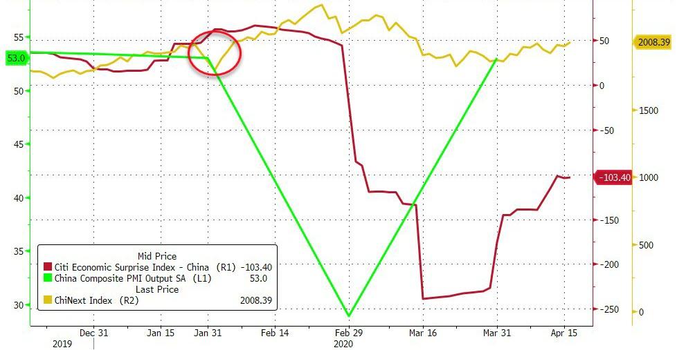 ZeroHedge - Apr 16th 2020 10:10pm EDT “A Bad Global Precedent” – Chinese GDP Collapses More Than Expected, Worse Since At Least 1992 So, the question is – just how ‘manufactured’ will this smorgasbord of Chinese macro data be? As v-shaped as the incredible ‘survey’ data? Or as realistic as the traffic and pollution numbers suggest? The red oval is the ChiNext […]