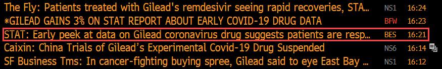 ZeroHedge - Apr 16th 2020 8:46pm EDT Gilead Pours Cold Water On Report That Sent Market Soaring: “Anecdotal Reports With No Statistical Power” After a one-two punch of disappointing news for Gilead out of China, where as we reported yesterday a trial of remdesivir in Covid-19 patients with mild or moderate symptoms was suspended as no eligible patients could be recruited according […]