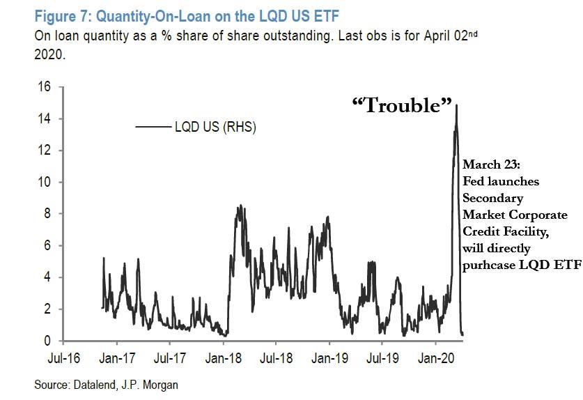 ZeroHedge - Apr 14th 2020 5:05pm EDT Meet The “Fed Fighters”: Junk Bond ETF Shorts Hit An All Time High Despite Fed Backstop Three week ago we showed the dramatic crushing of shorts in the investment grade bond ETF, the LQD, where shorts initially soared higher in the first half of March as credit prices tumbled, then plummeted to all time lows […]