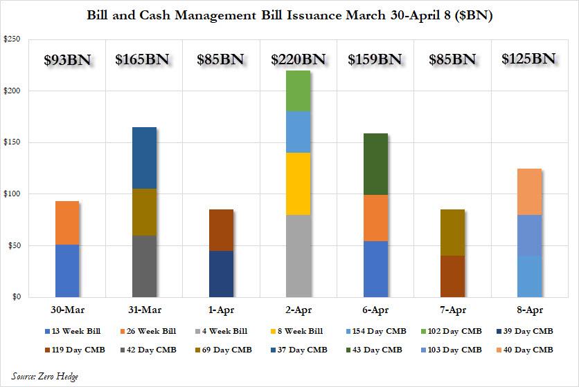 ZeroHedge - Apr 8th 2020 9:40pm EDT US Treasury Balance Hits Record $750 Billion After Historic Flood Of Bill Issuance It may not quite be last week’s $563 billion T-bill deluge, but it will do. After a tsunami of new T-Bill and Cash Management Bill issuance last week, which saw no less than $85 billion in new short-term debt issued every every […]