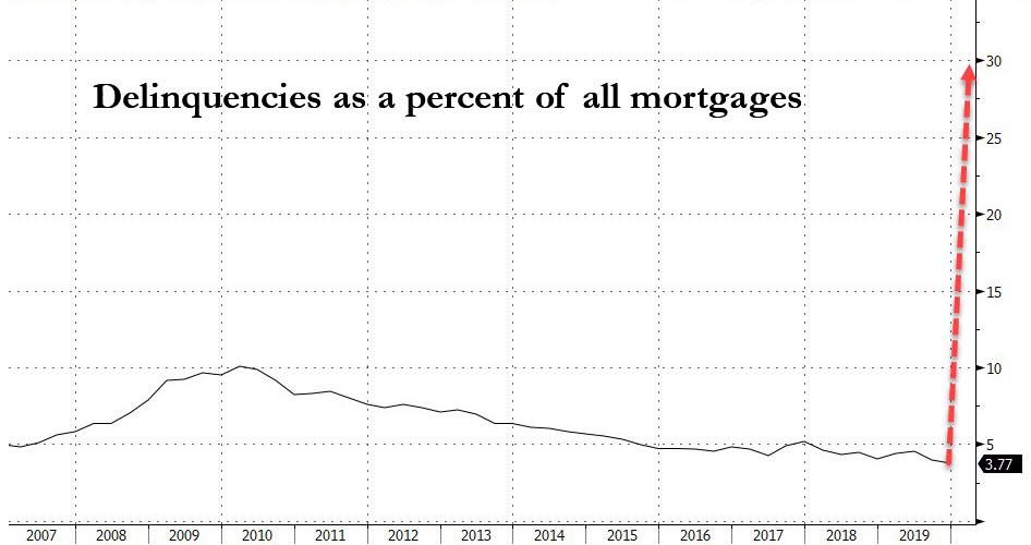 ZeroHedge - Apr 8th 2020 10:31pm EDT Americans Not Making Their Mortgage Payments Soar By 1064% In One Month Earlier today we reported that the “The Liquidity Crisis Is Quickly Becoming A Solvency Crisis”, and nowhere is this more true than for US homeowners. According to the latest Mortgage Bankers Association Forbearance and Call Volume Survey which highlights the “unprecedented, widespread mortgage […]