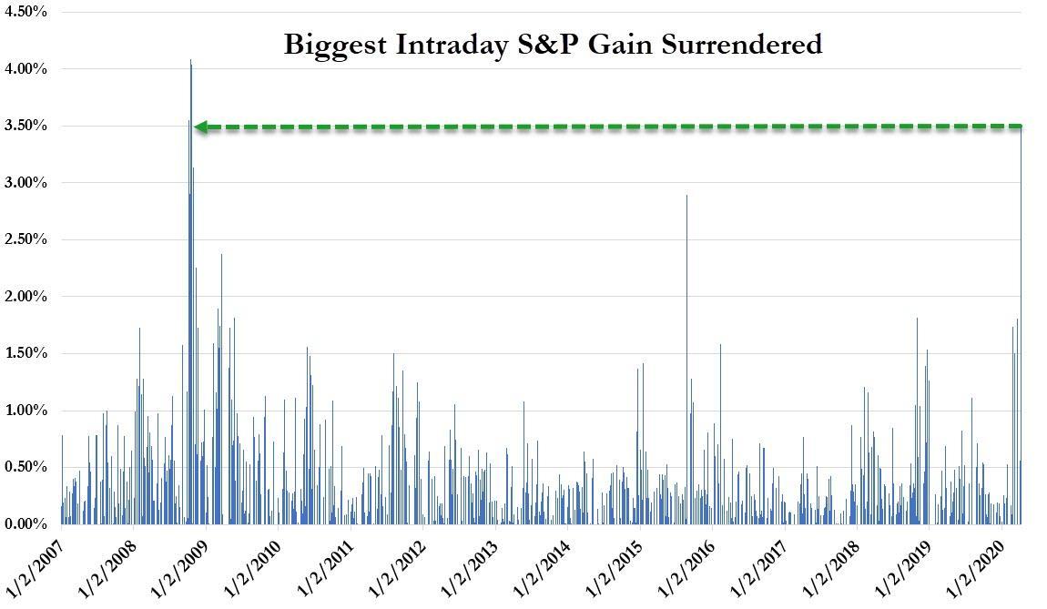 ZeroHedge - Apr 8th 2020 8:24am EDT Futures Rebound From Tuesday’s Historic Reversal Despite European Chaos S&P futures rebounded and European stocks fell as investors were conflicted by Tuesday’s late plunge – which saw stocks close red after the biggest surrender of gains since Oct 2008… … and the latest data surrounding the coronavirus economic, as well as the ongoing political chaos […]