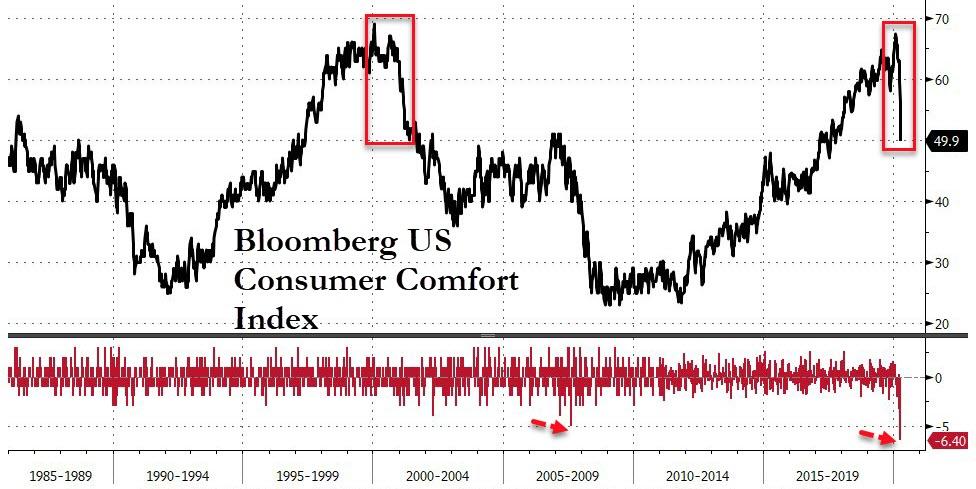ZeroHedge - Apr 8th 2020 9:57am EDT US Consumer Comfort Crashes By Most Ever The Bloomberg Consumer Comfort Index plunged 6.4 points in the week ended April 4 to 49.9, the lowest since October 2017. Source: Bloomberg This is the biggest weekly drop in history – worse than during the great financial crisis – and mimics (though considerably faster) the collapse in confidence after […]
