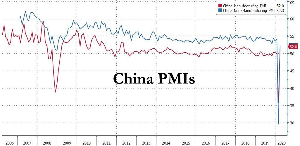 ZeroHedge - Mar 30th 2020 9:23pm EDT China Is Fixed: Chinese PMIs Soar Back Into Expansion, Smashing Expectations Remember the record plunge in China’s manufacturing and non-manufacturing PMI for February when the entire economy imploded as a result of coronavirus pandemic? Well, forget all about it, because in the latest farce out of Beijing, moments ago the goalseekers at the National Bureau […]