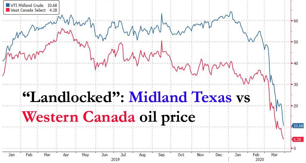 ZeroHedge - Mar 30th 2020 3:50pm EDT Texas Or Canada: Where Will Oil Hit $0 First Looking at the future of oil prices, Goldman was downright apocalyptic in its short-term forecast, when in a note published this morning, the bank’s chief commodity strategist Jeffrey Currie speculated that as the current production glut “shock” cripples the crude transportation networks, “a producer would be […]