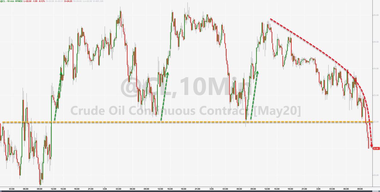 ZeroHedge - Mar 26th 2020 1:52pm EDT Oil Plunges After IEA Hints Russia, Saudis Would Need To Completely Halt Production To Balance The Market With stocks soaring and even the VIX sliding today, there is one asset class that refuses to confirm the 3rd consecutive day of investor euphoria: no, not bonds which are being bought aggressively again (today’s 7Y auction was […]
