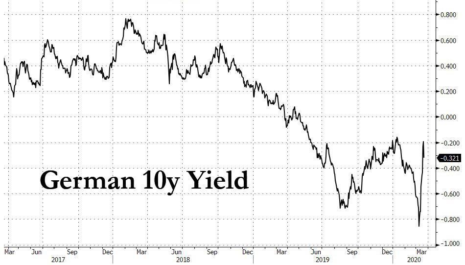 ZeroHedge - Mar 23rd 2020 1:15pm EDT Germany Supports Rescue Loan For Italy Through Euro Area Bailout Fund Who would have thought just one month ago, that “stingy, austere” Germany would emerge in just a few short weeks as a supporter of a European fiscal stimulus gusher. After a weekend in which Germany’s “debt brake”, aka “black zero” balanced-budget policy was finally […]