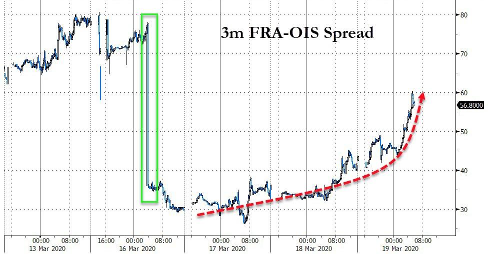 ZeroHedge - Mar 19th 2020 9:01am EDT Fed Boosts Daily QE By 66% Overnight To Record $75 Billion In One Day Overnight saw the addition of yet another four-letter-acronym bailout fund from The Fed but signals from the market suggest that they are once again losing control of the dollar-shortage-driven liquidity crisis as the FRA-OIS spread has started to rise sharply once […]