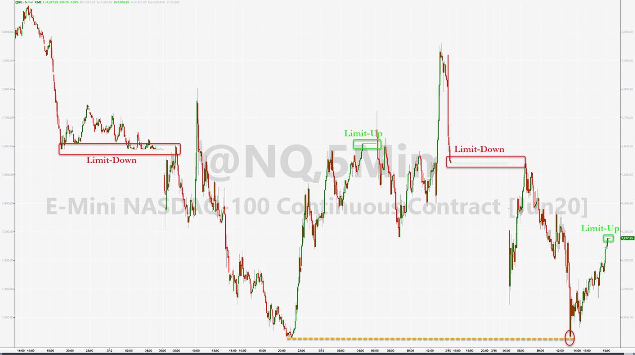ZeroHedge - Mar 16th 2020 9:26pm EDT Nasdaq, Dow, S&P Futures Surge Limit-Up, Erasing Trump Presser Melt-down Another overnight session that reverses trend entirely from the day session… and another limit-up futures halt… Nasdaq futures are limit-up… once again… S&P futures are limit-up… And for context, Dow futures (are limit-up) have erased the late-day melt-down during Trump’s presser, up almost 1000 off […]
