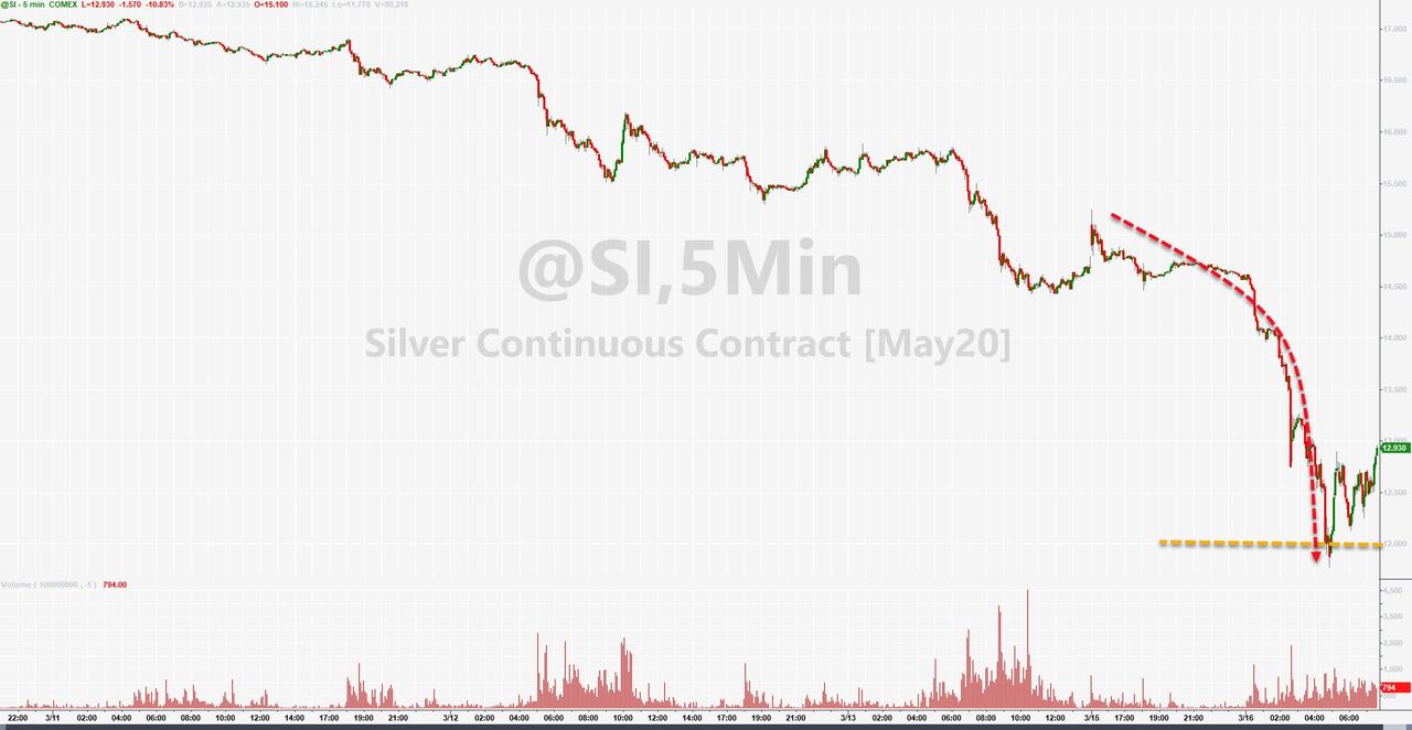ZeroHedge - Mar 16th 2020 10:39am EDT Silver Crashes To $11 Handle – To 11-Year Lows Silver has been clubbed like a baby seal this morning, crashing to an $11 handle… Plunging Silver to its lowest since January 2009 And while precious metals are getting pummelled… Compared to gold, silver is a bloodbath… As Mike Maloney notes below: “At no time in […]