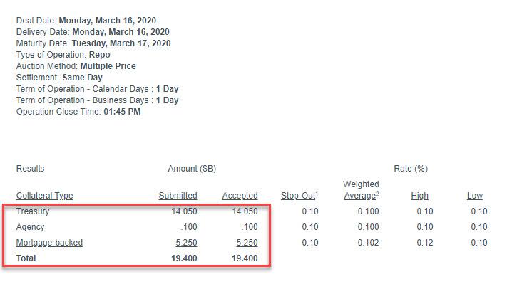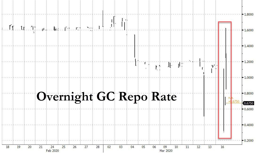 ZeroHedge - Mar 16th 2020 2:08pm EDT Emergency Fed Repo Fiasco: Funding Markets Remain Frozen After Dealers Balk At $500BN Operation Less than an hour ago, when previewing today’s emergency repo operation which the fed announced ad hoc on Monday morning in response to the latest credit market turmoil, this time affecting the GC repo rate, we said that “we don’t even […]