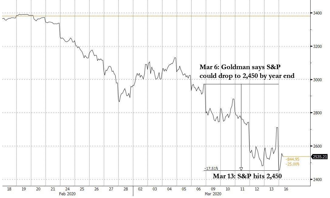 ZeroHedge - Mar 16th 2020 12:40pm EDT How Much Further Can Markets Fall? Here Is One Bank’s Answer On Friday, March 6, Goldman’s chief US equity strategist, David Kostin, who bizarrely still holds held the view that the S&P will close the year at 3,200, despite now expecting an earnings recession, and Gldman economists calling for an economic recession in Q2 and […]