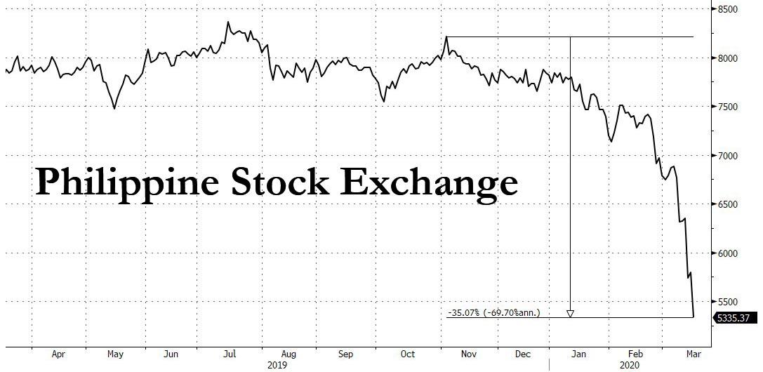 ZeroHedge - Mar 16th 2020 11:06am EDT Philippines Is First Country To Halt Its Market “Until Further Notice” Following two weeks of relentless market turmoil, traders were wondering which country’s stock market would be shut down first. Moments ago we got the answer when the Philippine Stock Exchange announced it is suspending trading “until further notice” after the country’s President Rodrigo Duterte […]