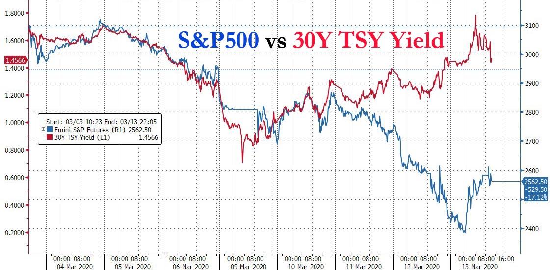 ZeroHedge - Mar 13th 2020 10:52am EDT BMO: “The Disconnect Between Treasuries And Stocks Is The Most Widely Debated Topic At The Moment” Authored by Ian Lyngen, Ben Jeffery and Jon Hill, rates stretegists at BMO Capital Markets A sense of uncomfortable calm has fallen on financial markets overnight following the Fed’s announcement of additional liquidity measures and the PBOC’s drop of […]