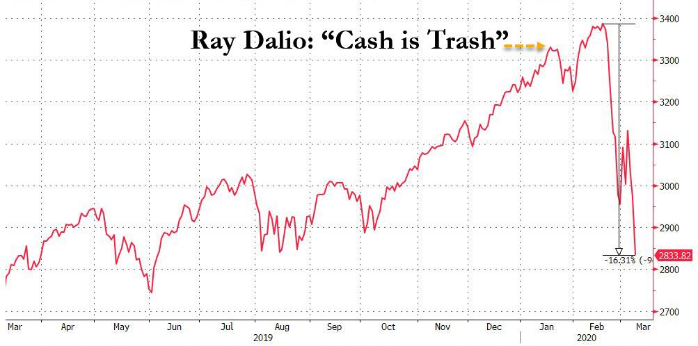 ZeroHedge - Mar 13th 2020 2:44pm EDT Six Weeks After Dalio’s “Cash Is Trash”, Cash Sees Biggest Inflow In History The past week has been one of market superlatives: the biggest Dow point crash ever, the biggest Stoxx 600 drop on record, the longest lock “limit down” in the Emini future ever observed, the biggest rebound in the Dow since the financial […]