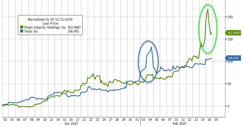ZeroHedge - Feb 19th 2020 10:00am EST To The Moon, Alice! Virgin Galactic Options Volume Explode As Retail Piles In In case you missed it… there’s a futurist, technology stock that has utterly exploded higher this year against a background of absolutely nothing new fundamentally. No, it’s not Tesla. It’s Richard Branson’s Virgin Galactic (SPCE)… which as of yesterday’s highs was up […]