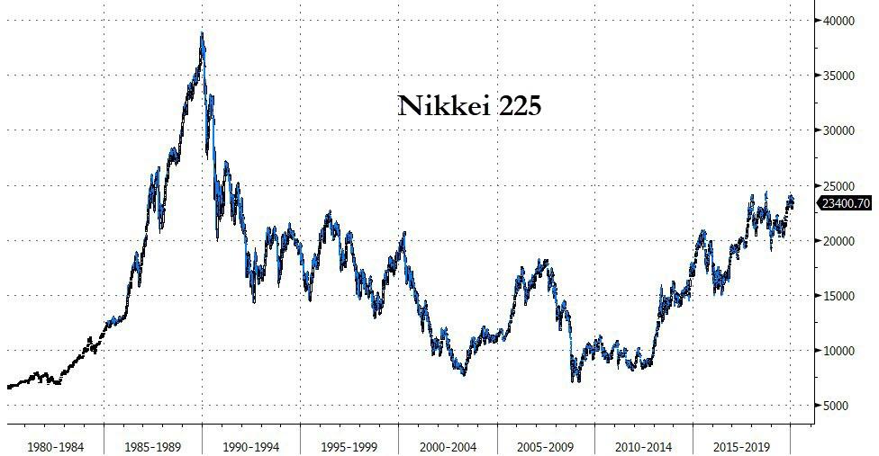 ZeroHedge - Feb 19th 2020 1:00pm EST Are The Japanese Losing Faith? Yen Crashes Near Record Lows Against Gold 31 years ago, the Japanese stock market hit a record high. It remains 38% below that high (not adjusted for inflation), crushing the global narrative that ‘buy and hold’ in stocks works “over the long run.” Source: Bloomberg Are the Japanese losing faith […]